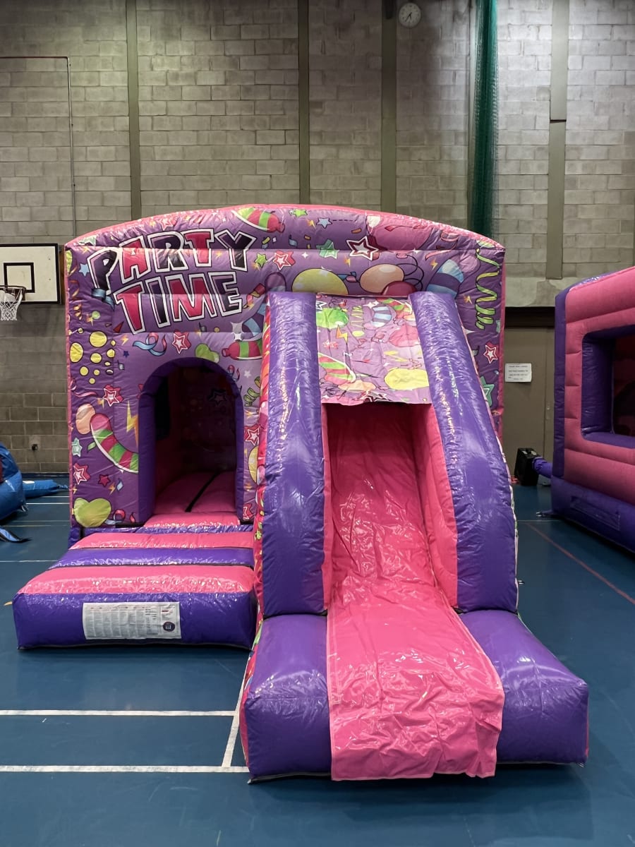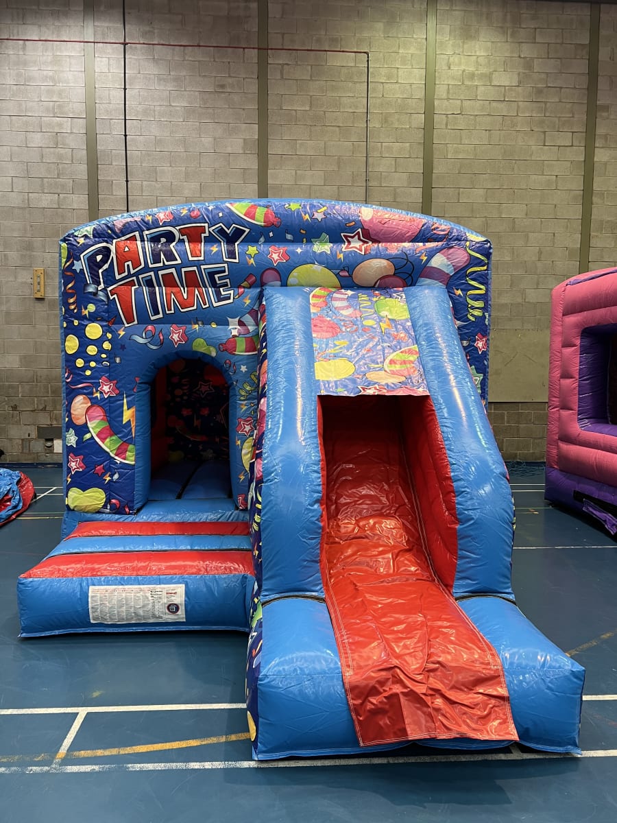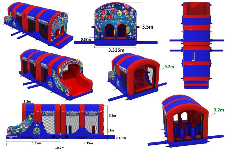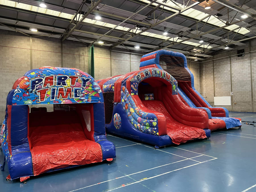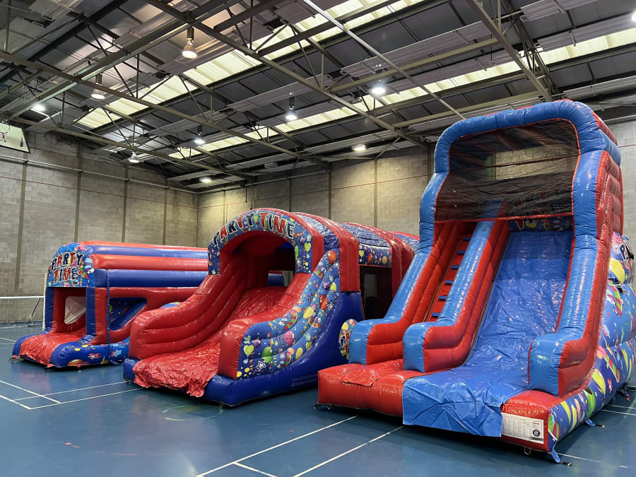 This 2 part party themed adult and kids assault course is a fantastic bit of kit, suitable for garden parties, school fun days, corporate events & church halls. Race through biff and bash pillows, inflatable tunnels and make your way onto the up and over slide to become the winner.