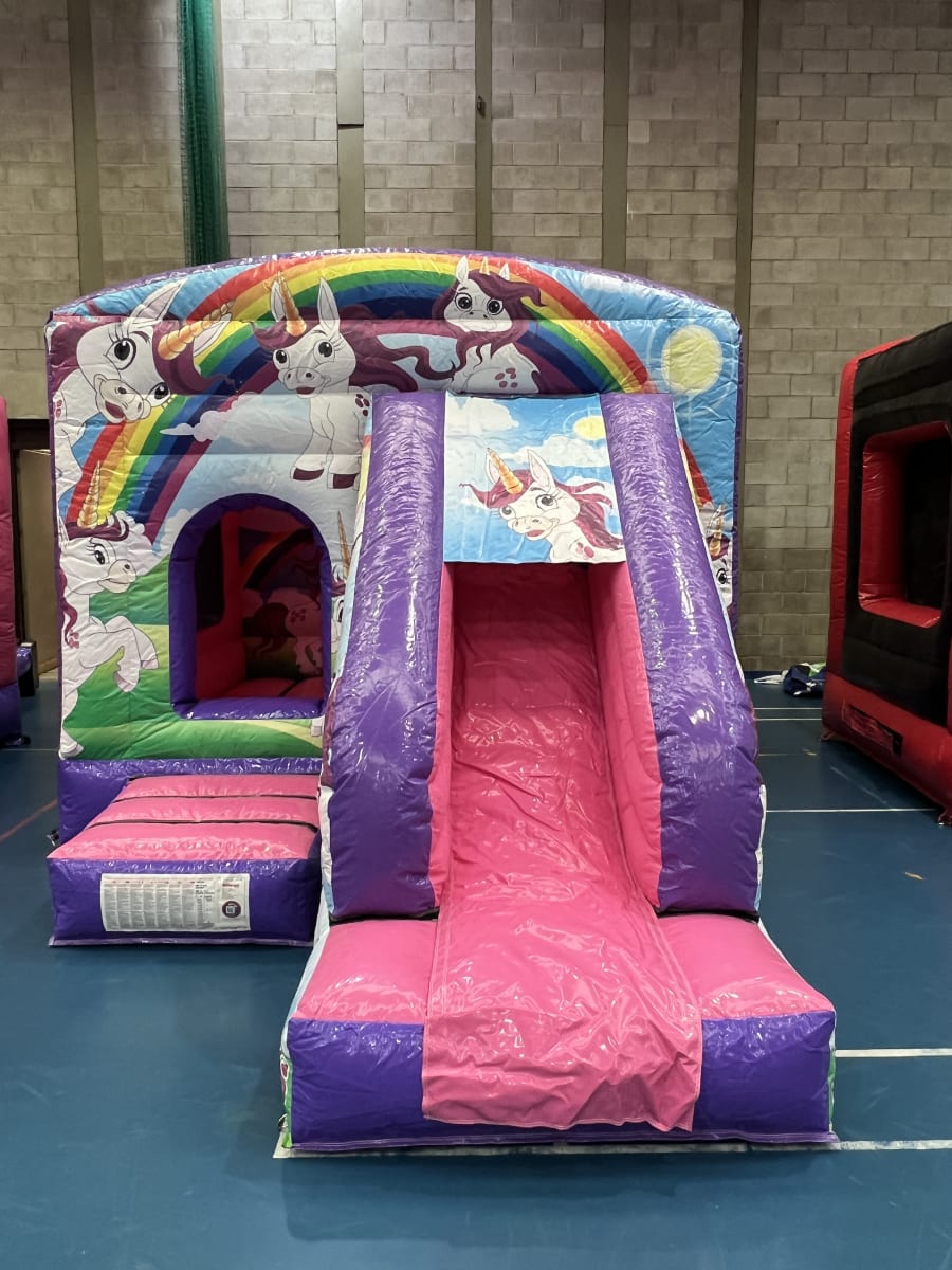 This Unicorn Bounce and Slide is a real stand out inflatable. It features some eye catching designs, from the pretty rainbows to the beautiful floating Unicorns in the sky.This will sure be the highlight of your party, with its vibrant design and amazing girly colours.
